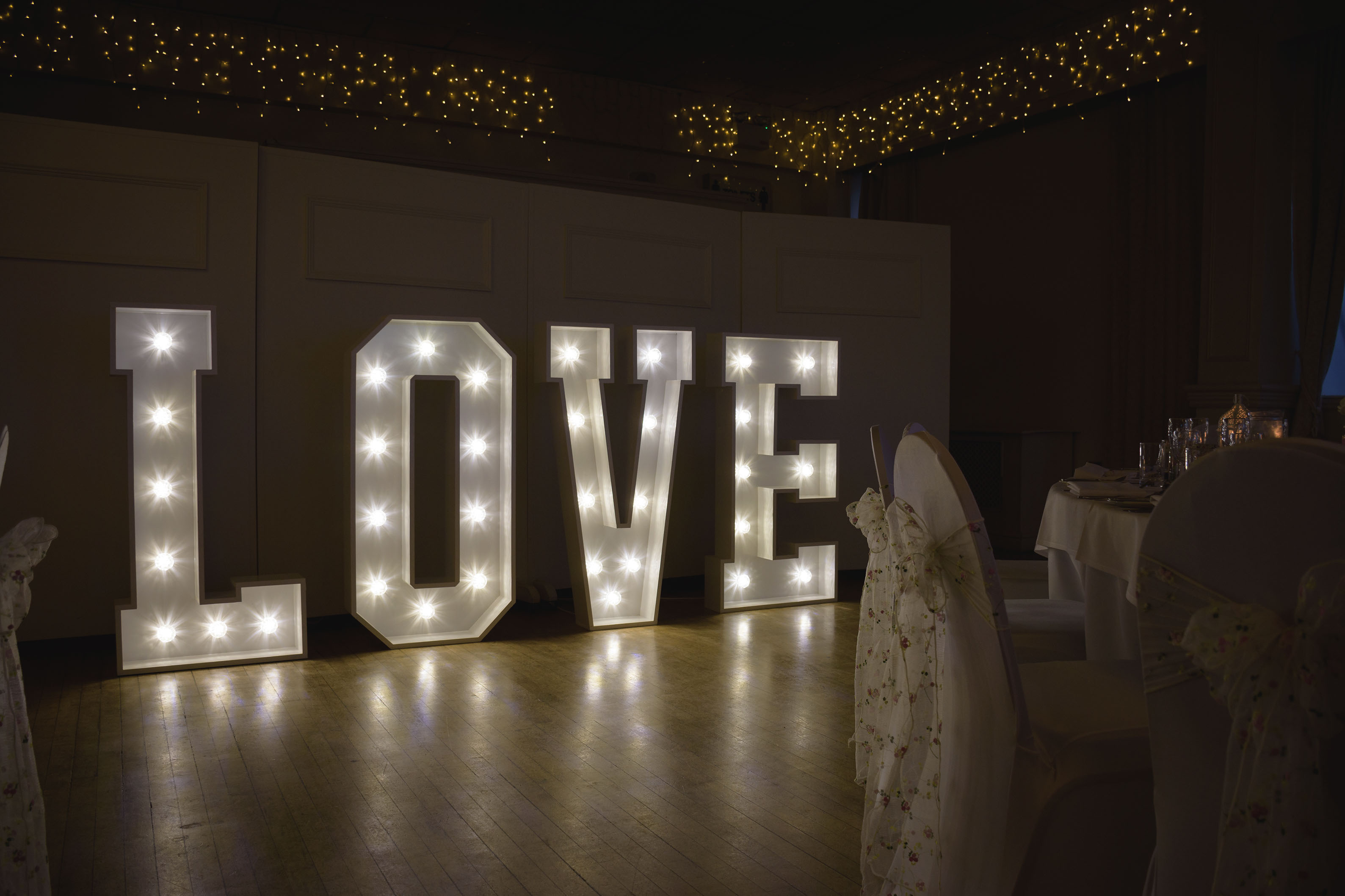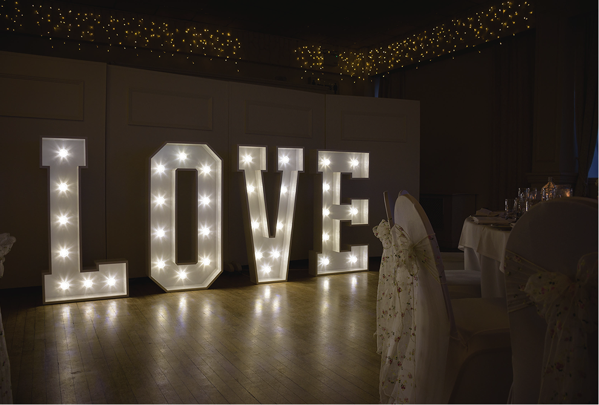 Our letters are 4ft high by 2ft wide, some of our letters are a little wider such as M, W and & sign. Our letters are fairly heavy, however we will deliver, set up and then collect the following morning from your venue. Each letter is connected with 3m power cable, we also supply an extension lead if required.